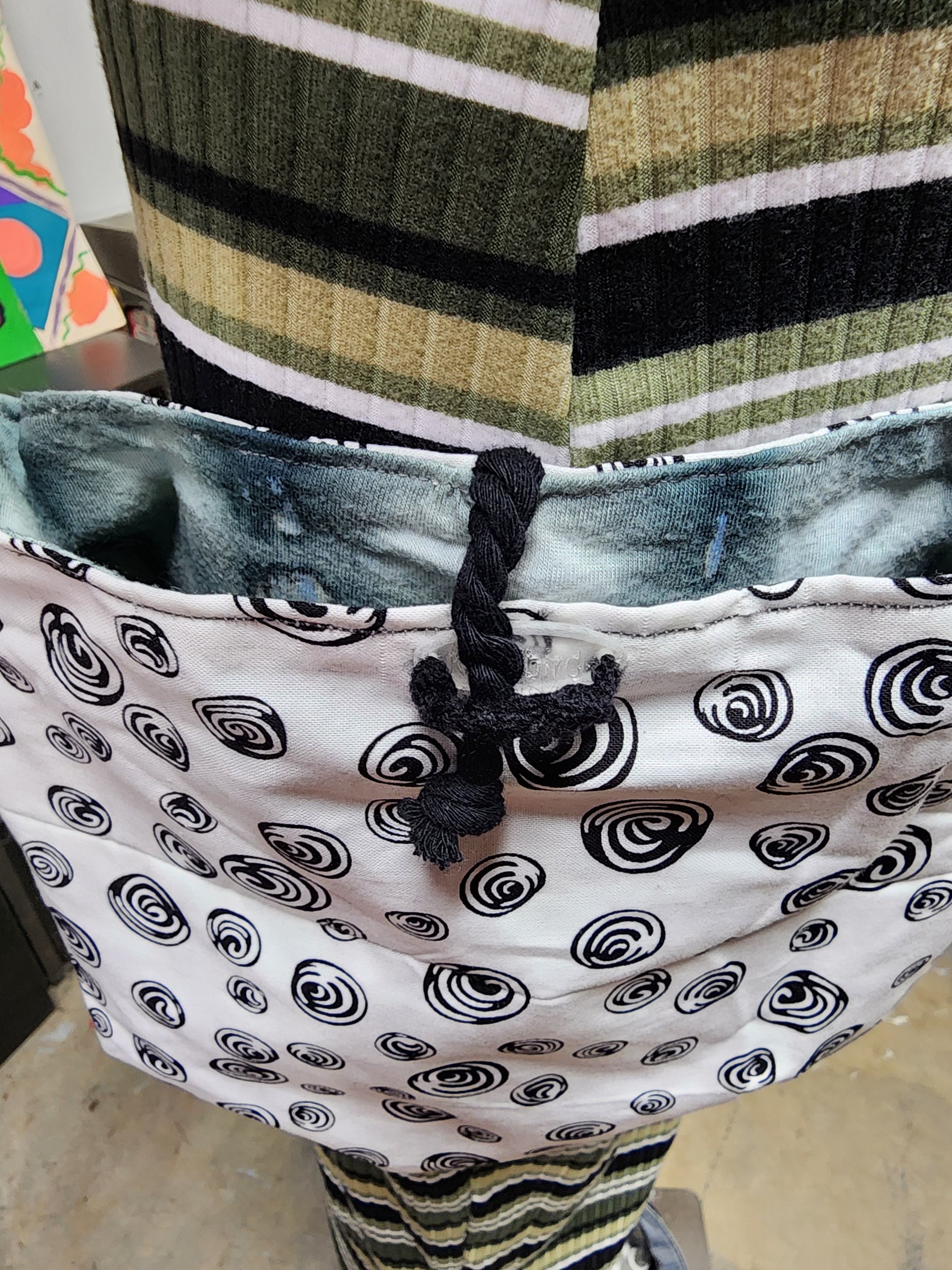 This hippie boho bag is reversible with a Kraf-Tbird bead and loop closure. It is 9" wide and 8" deep with a black nylon strap that hangs 24" from shoulder. It can be worn over the shoulder or across the body for more security. It is a geometric print with a blue/grey tie dye lining. It is reversible. Machine wash/tumble dry.