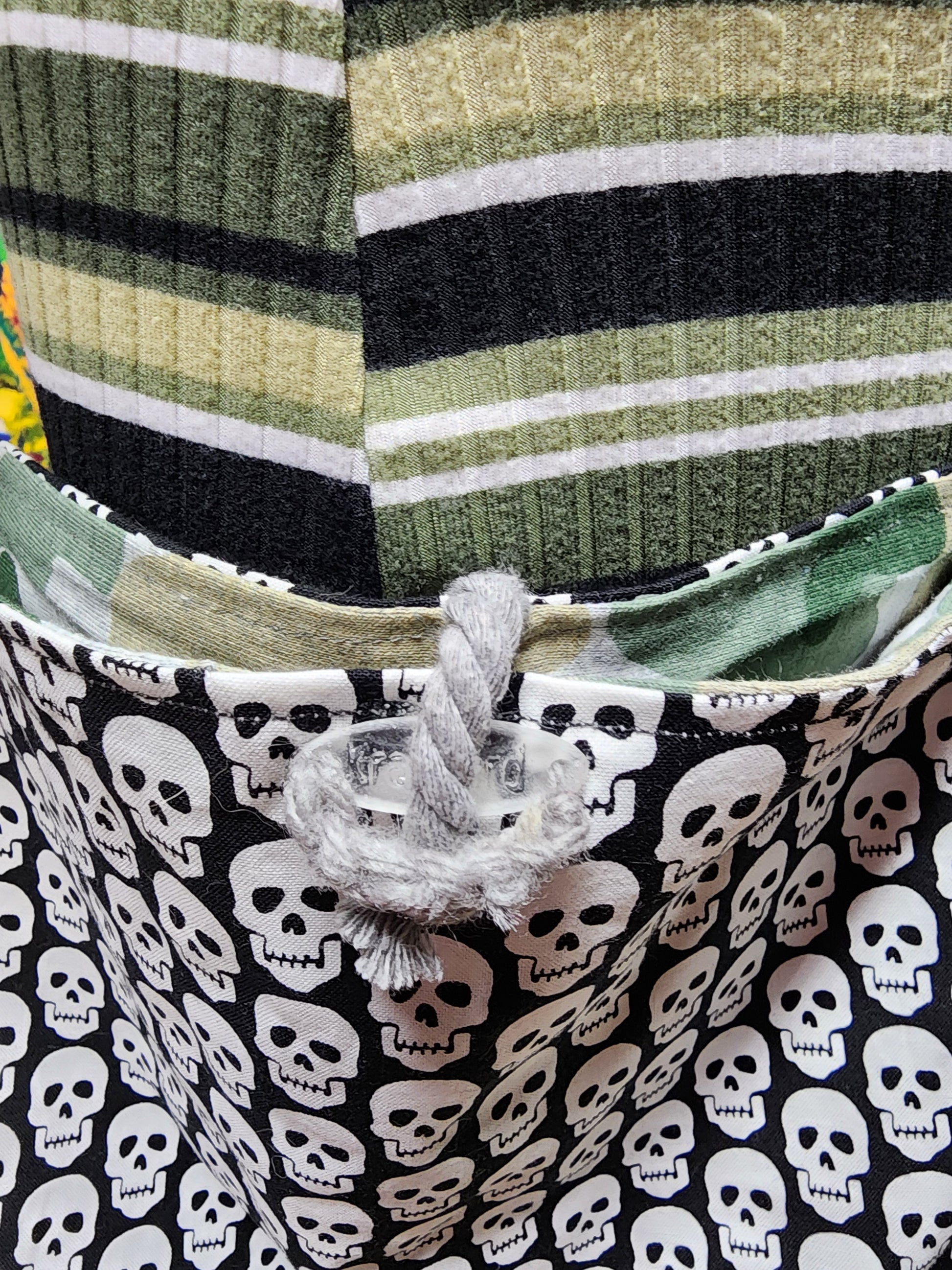 This hippie boho bag is reversible with a Kraf-Tbird bead and loop closure. It is 9" wide and 8" deep with a camoflauge nylon strap that hangs 24" from shoulder. It can be worn over the shoulder or across the body for more security. It is a skull print with a camoflauge lining. It is reversible. Machine wash/tumble dry.
