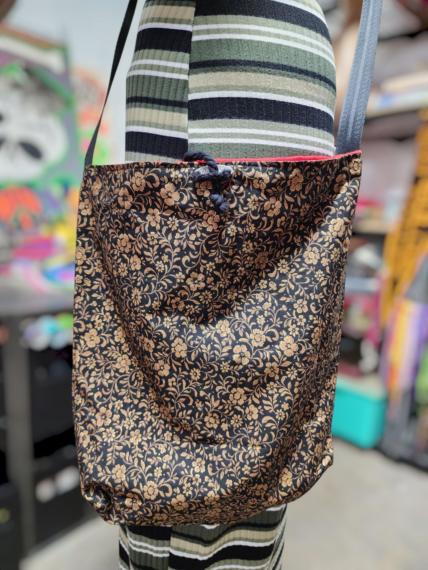 Handmade Hippie Boho Reversible Crossbody Bag (Gold Floral Print on Black)