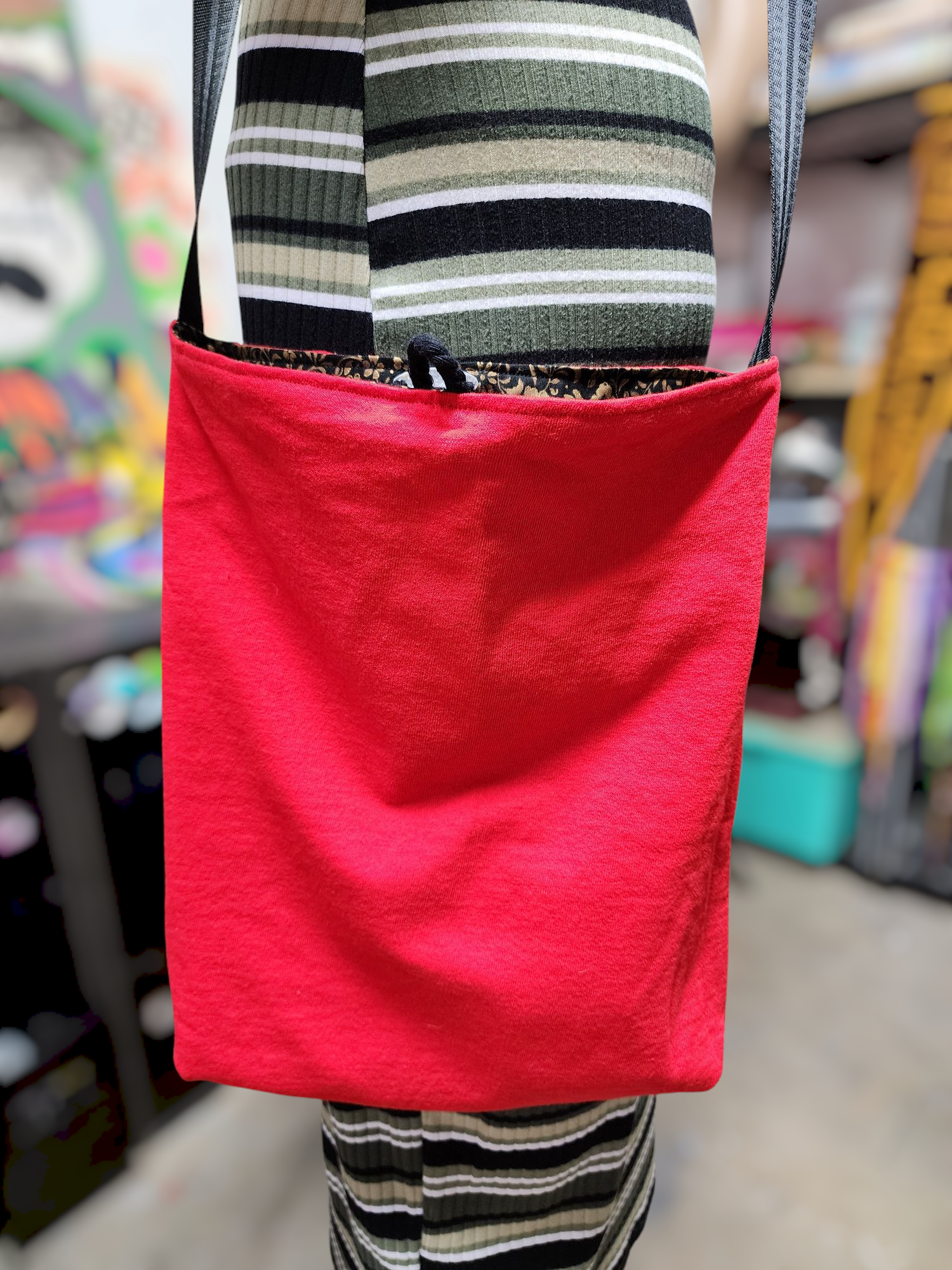 This hippie boho bag is reversible with a Kraf-Tbird bead and loop closure. It is 9" wide and 13" deep with a black nylon strap that hangs 24" from shoulder. It can be worn over the shoulder or across the body for more security. It is a gold floral print with a red lining. It is reversible. Machine wash/tumble dry.